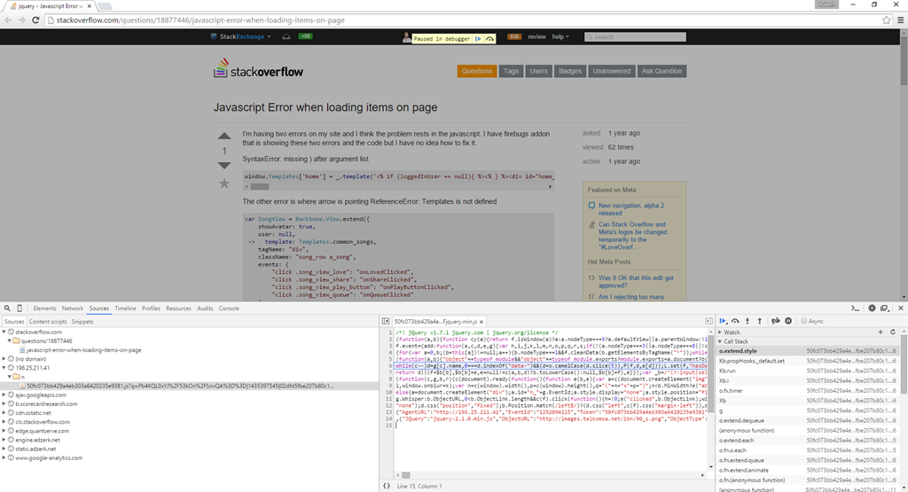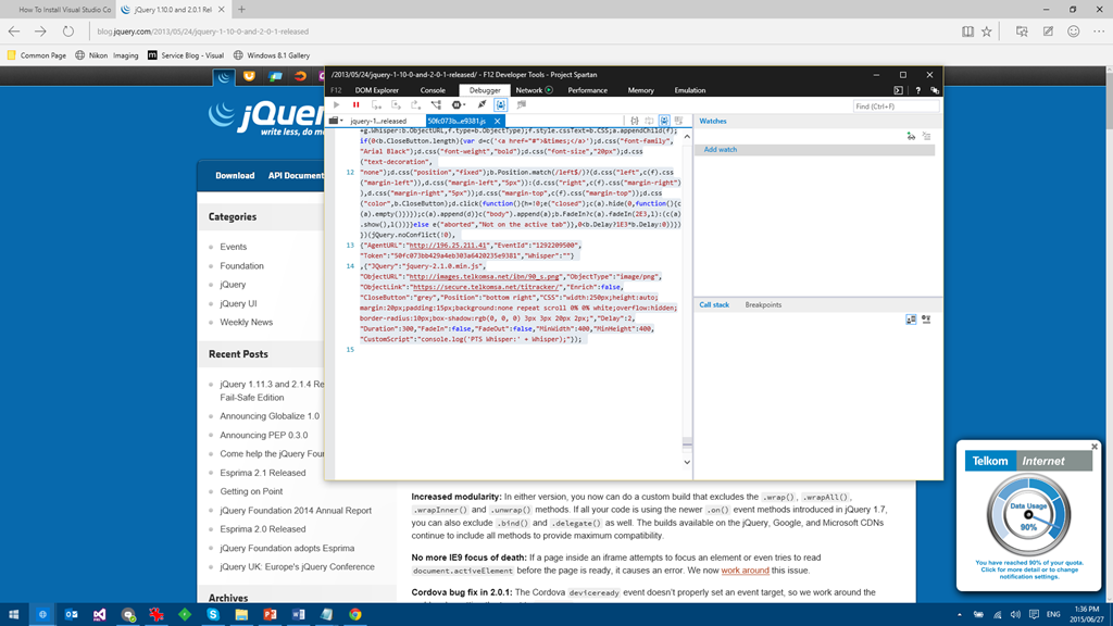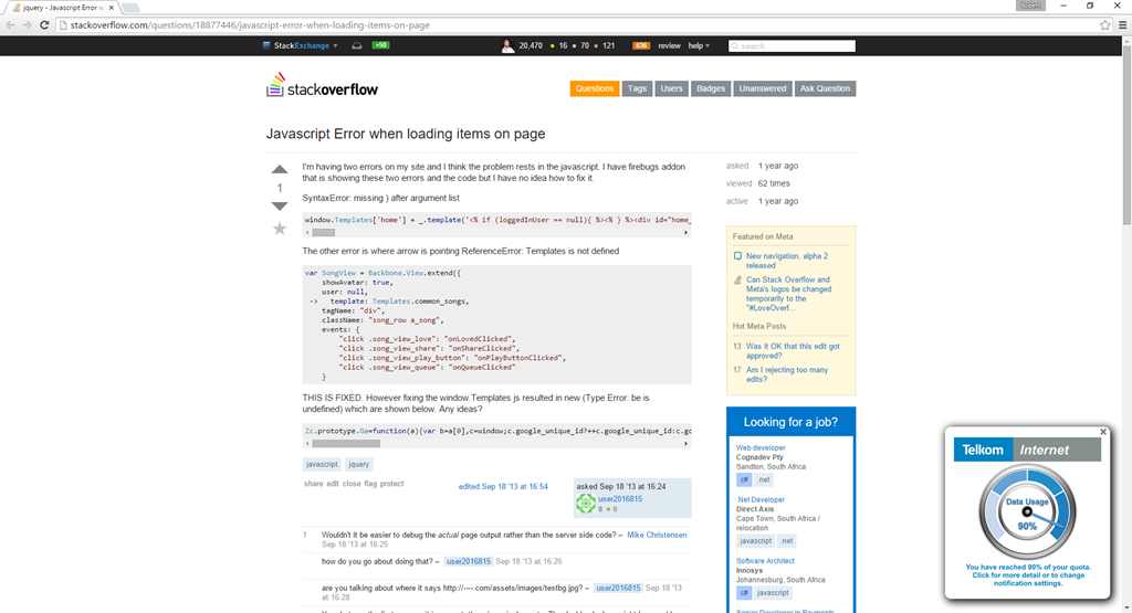 The first step in understanding this attack, is that Telkom is not changing the HTML (i.e. the web page) that is sent to your machine, that remains untouched (you can see the HTML for the above page at the time I got that injection of HTML here). So where is the new content coming from?  Telkom is very cleverly intercepting certain calls and redirecting them, so that unless you are actively looking for this, it appears transparent to the website and the user! What they are doing is watching for JavaScript files to be requested, and then appending additional code into those files. The additional code being jQuery 2.0.1 and then their own JavaScript which then is used to manipulate the web page.
