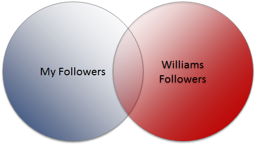 This second tweet starts with William Branders name, so only people who follow BOTH of us will see it. In other words, it is only that group in the middle of the following Venn chart which will see that tweet!