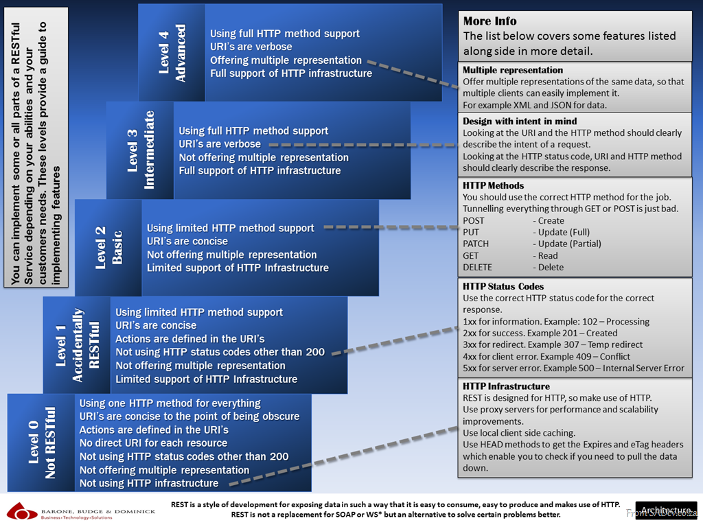 Today’s quick reference poster looks at REST services and gives a guide to how RESTful (or not) your services are, from level 0 (not restful) to level 4 (using everything). These are not a scientific levels, it is just a simple classification I devised to promote easy communication about the services. The idea for this is to promote thinking about what features to use and assist with communication in a team. It is not a a requirement to always have level 4, some times you just need level 1 and this fine – do not over engineer for the sake of saying you are level 99.