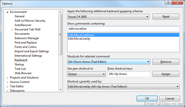 Did you have something already on the Alt+↑ or Alt+↓ or maybe you want to bind to something else? You can do this in Tool (menu) –> Options –> Environment –> Keyboard. The commands are: