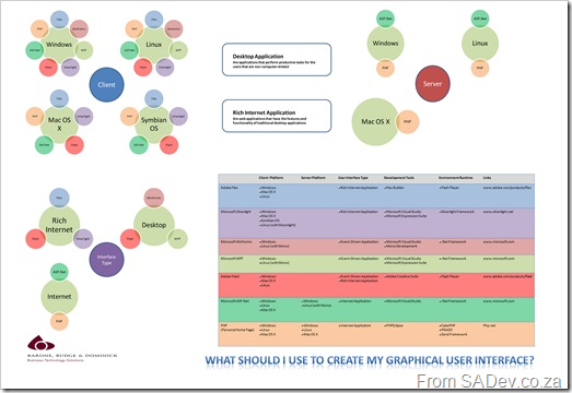 Herman, who you may know as “The man without a blog” or “The Delegator” or the guy who works over the partition from me, has released a poster detailing UI interface choices there are and what are the factors involved with choosing that. Very good to have if you trying to decide between Silverlight, Flash, Flex, ASP.NET, WinForms, WPF etc…
