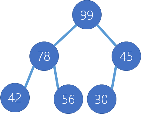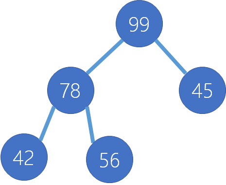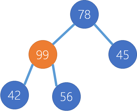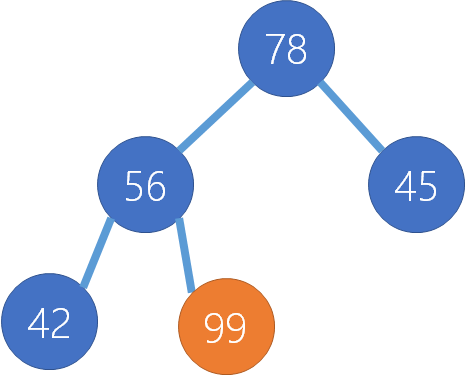 We add 99 as a child of 56. 99 is larger, so we then swap 99 and 56. 99 is still larger than 78, so we need to swap those nodes too | {width=100} {width=100} {width=100} |