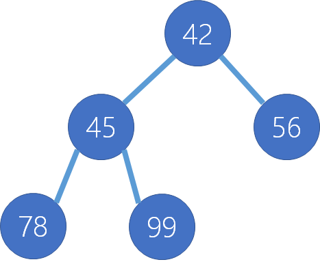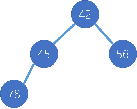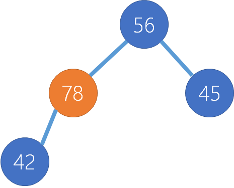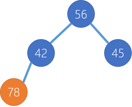 We add 78 as a child of 42, though it is larger so it must be swapped. 78 is now a child of 56, which still wrong so we need to swap them too. | {width=100} {width=100} {width=100} |