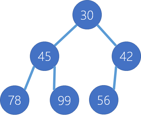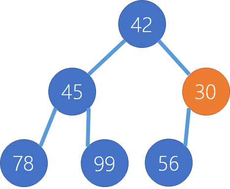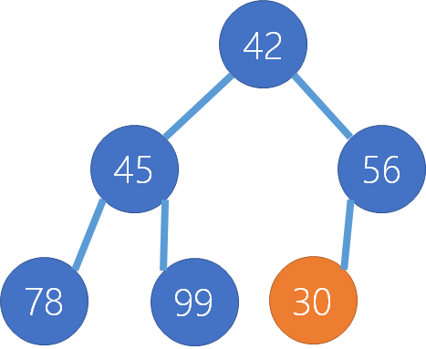 | 6 | Next we add 30 under 56. It is smaller than 56 so it must be swapped. Once swapped, its parent 42 is also larger so they need to swapped too. | {width=100} {width=100} {width=100} |