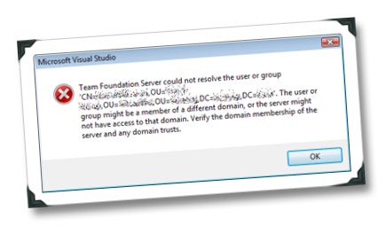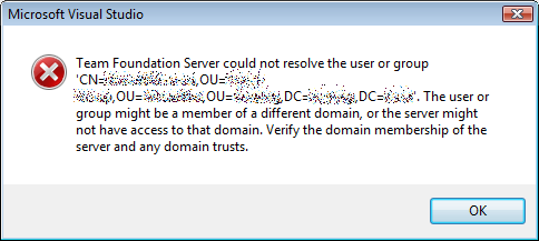 Regardless if I used the command line, or the TFS admin tool or the GUI I kept getting an error: Team Foundation Server could not resolve the user or group. <AD Distinguished Name of the User>. The user or group might be a member of a different domain, or the server might not have access to that domain. Verify the domain membership of the server and any domain trusts.