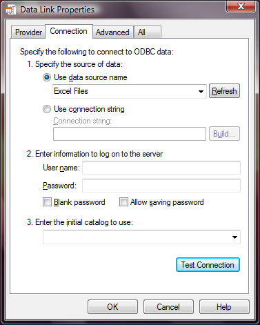 To do this you create a new empty file somewhere (desktop is good, cause you can go right click New -> Text Document). The trick is to make sure the file extension is udl (i.e. connection.udl). Now you can double click this file and using the (possibly) familiar connection wizard/odbc thing to set and test the values the values: